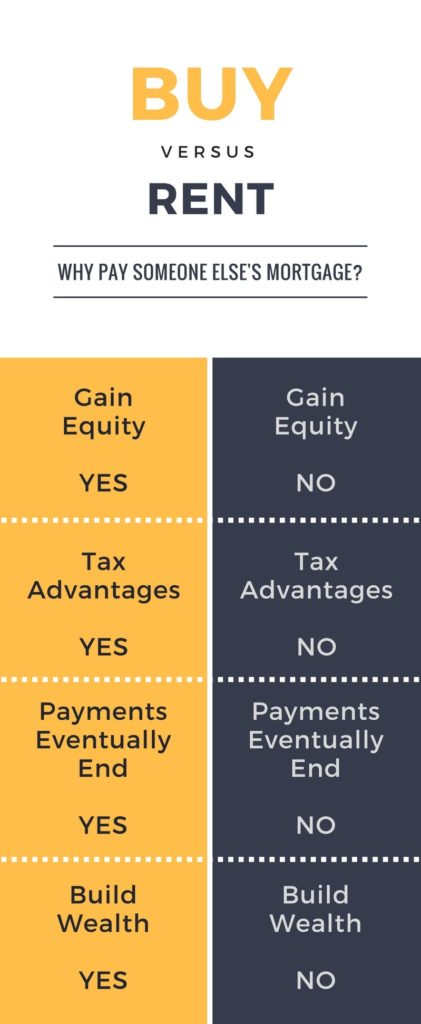 When you rent, you pay someone else’s mortgage. You’re helping someone else obtain the benefits of home ownership.